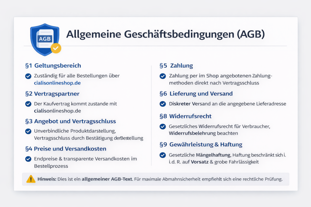 Diese Allgemeinen Geschäftsbedingungen (AGB) gelten für alle Bestellungen und Vertragsabschlüsse, die über die Website cialisonlineshop.de zwischen dem Betreiber der Website und dem Kunden abgeschlossen werden.