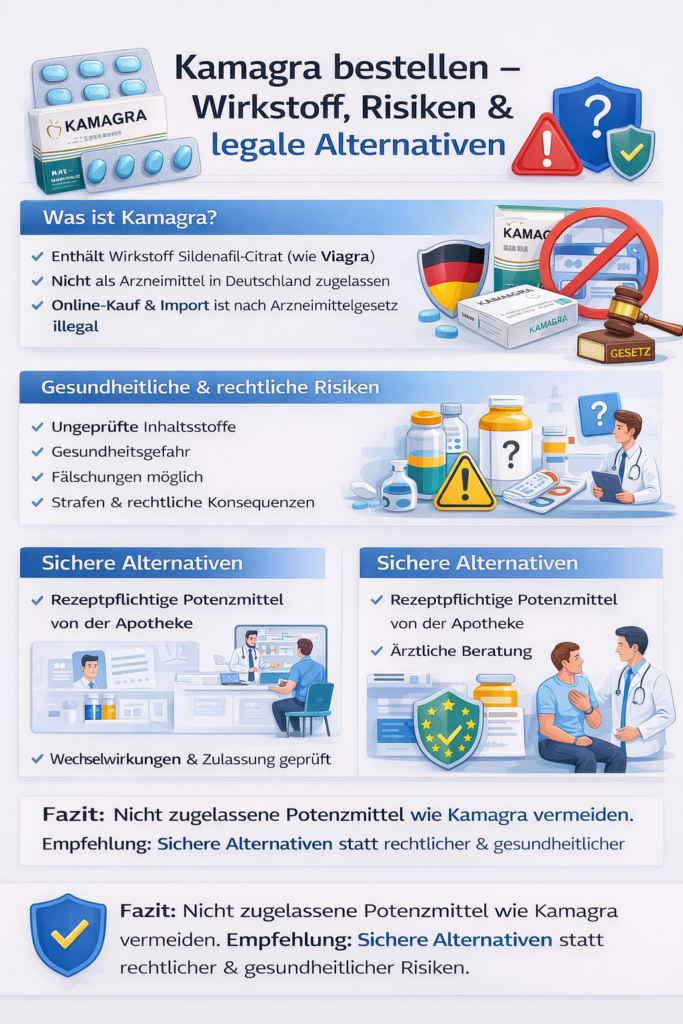 Kamagra ist ein Produkt, das häufig im Internet gesucht wird, wenn Männer nach Unterstützung bei erektiler Dysfunktion suchen. Doch bevor man sich zu einer Bestellung entscheidet, ist es wichtig, sich umfassend zu informieren – insbesondere über Recht, Sicherheit und mögliche Alternativen. In diesem Beitrag erklären wir verständlich: Was ist Kamagra genau? Kamagra ist ein Arzneimittel,
